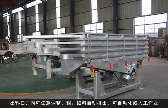 不锈钢直线筛主要由筛箱、筛框、筛网、振动电机、电机台座、减振弹簧、支架等组成。采用双振动电机驱动,当物料从给料机均匀地进入筛分机的进料口,在振动电机的激振下,向出料口方向边跳动边筛分,通过多层筛网筛分出数种产品和不合格的筛上、筛下物,分别从各自的出口排出,流入料仓或盛料筒,从而达到对物料进行筛选和分级的目的。