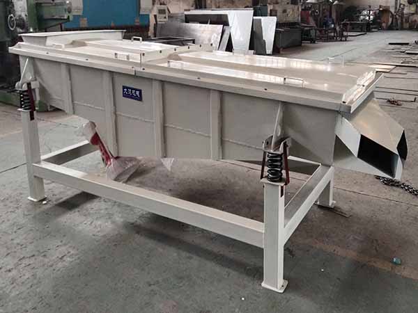 1、筛箱:由数种厚度不同的钢板焊制而成,具有一定的强度和刚度,是筛机的主要组成部分。2、筛框:由松木或变形量较小的木材制成,主要用来保持筛网平整,达到正常筛分。3、筛网:有低碳钢、黄铜、青铜、不锈钢丝等数种筛网。4、振动电机(使用与维修方法详见振动电机使用说明书)。5、电机台座:安装振动电机,使用前连接螺钉必须拧紧,特别是新筛机试用前三天、必须反复紧固,以免松动造成事故。6、减振弹簧:阻止振动传给地面,同时支持筛箱的全部重量,安装时,弹簧必须垂直与地面。7、支架:由四个支柱和两个槽钢组成,支持着筛箱,安装时支柱必须垂直与地面,两支柱下面的槽钢应相互平行。风冷式直线振动筛应用 大汉机械风冷式直线震动筛这对高温特性物料设计研发,可在有效降低物料温度后再对物料进行筛分,有效的提高了筛分效率及处理量,下面以洗衣粉为例说明风冷式振动筛的应用。洗衣粉在刚刚完成生产后,通常为120度左右的高温,如不进行降温处理,筛选分级非常困难,而洗衣服不适合传统的水冷式降温。在洗衣粉生产线上用“大汉牌”风冷式直线筛,刚生产完成120度高温洗衣粉通过输送设备直接进入风冷式直线振动筛,经过安装在设备进料口底部的风机降温冷却系统,(不符合要求的结块物料通过安装在进料口端的筛网筛选后从出料口旁的小型排料口排出,见右图,该装置可根据物料特性选装),可直接将洗衣粉温度降至40-50度后再进入直线振动筛完成筛选分级工作。风冷式直线振动筛安装调试与使用